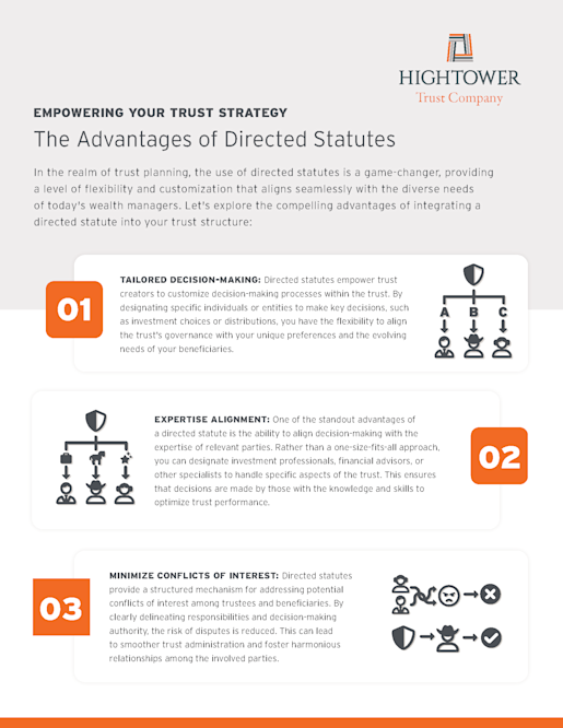 Services provided by Hightower Trust Company. Trust and agency services are provided by Hightower Trust Company, National Association (“Hightower Trust Company, NA”). Retirement Plan Services are offered by Trust Company of Illinois, charted by the Illinois Department of Financial and Professional Regulation. Hightower Trust Company, NA is a wholly owned subsidiary of Hightower Holding, LLC, and an affiliate of Hightower Securities, LLC, Member FINRA/SIPC, and Hightower Advisors, LLC (“Adviser”), an SEC registered investment adviser. Registration as an investment adviser does not imply a certain level of skill or training. Hightower Trust Company, NA delegates investment management authority to the Adviser. The Adviser receives an investment management fee that is part of the overall trustee fee that is charged by HighTower Trust Company, NA. All securities transactions are processed through registered brokers that are monitored by Hightower Trust Company, NA. Although not a material consideration, the Adviser may consider certain support services or products it receives from custodians (e.g. at a reduced or no additional cost) which assist Adviser in monitoring and/or servicing client accounts, in recommending a custodial platform to clients. Hightower Trust Company, NA, relies on Adviser for several administrative services and Adviser is reimbursed for actual costs and for services. This material is not intended or written to provide and should not be relied upon or used as a substitute for tax or legal advice. The information contained herein does not consider an individual’s or entity’s specific circumstances or applicable governing law, which may vary from jurisdiction to jurisdiction and be subject to change. Clients are urged to consult their tax or legal adviser for related questions.